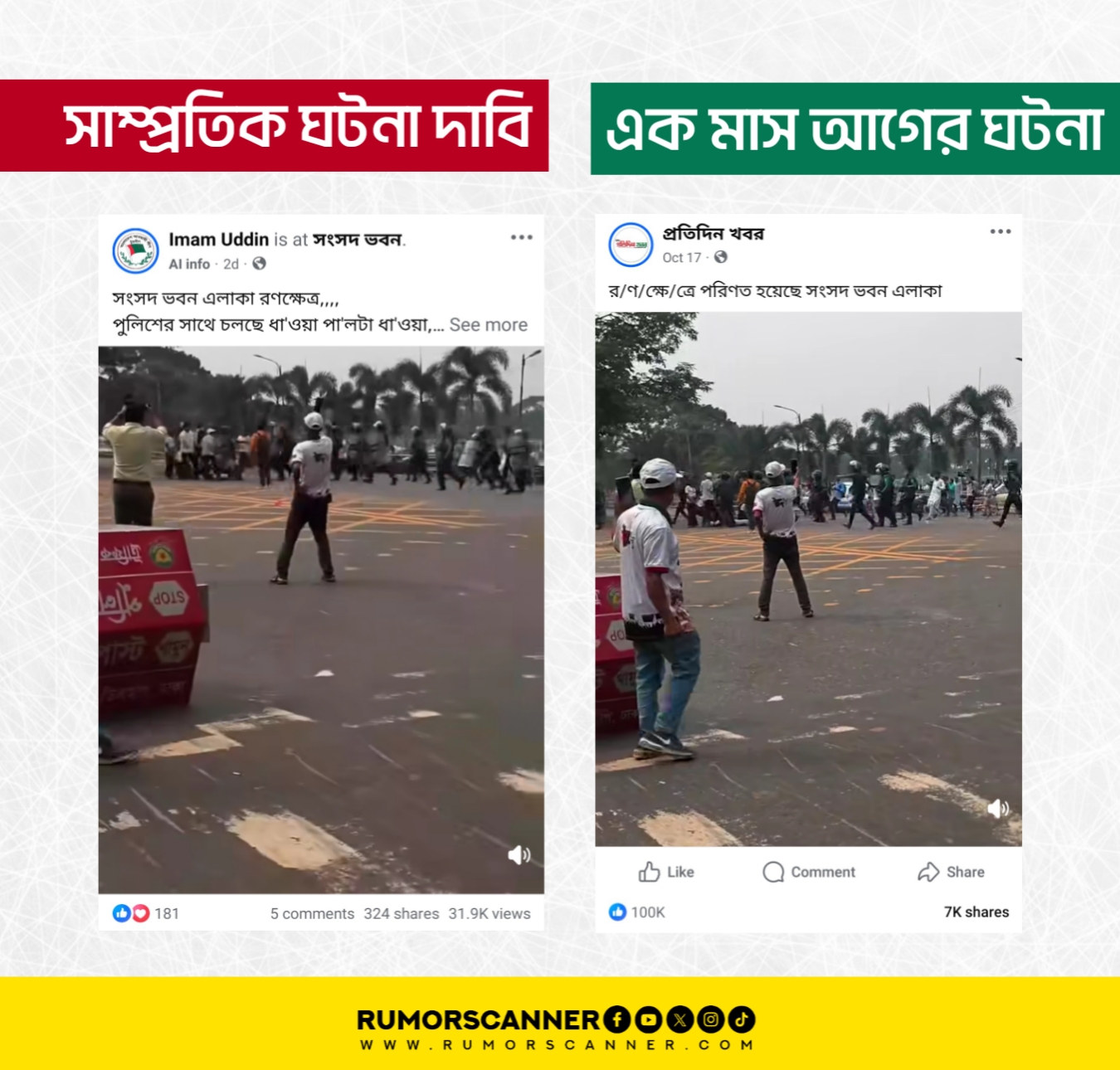 এ বিষয়ে অনুসন্ধানে ‘প্রতিদিন খবর’ নামের একটি ফেসবুক পেজ থেকে ১৭ অক্টোবর প্রকাশিত একটি ভিডিও পাওয়া যায়। ভিডিওর ক্যাপশনে লেখা রয়েছে, রণক্ষেত্রে পরিণত হয়েছে সংসদ ভবন এলাকা। উক্ত ভিডিওর সঙ্গে আলোচিত দাবিতে প্রচারিত ভিডিওটির পুরোপুরি সাদৃশ্য রয়েছে।
