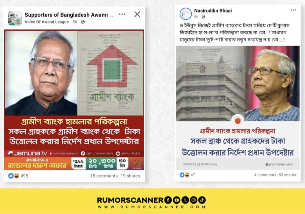 এরই প্রেক্ষিতে, গ্রামীণ ব্যাংক হামলার পরিকল্পনা; গ্রামীণ ব্যাংকের সকল শাখা থেকে গ্রাহকদের টাকা উত্তোলন করার নির্দেশ দিয়েছেন প্রধান উপদেষ্টা ড. মুহাম্মদ ইউনূস- শীর্ষক দাবিতে মূলধারার ইলেকট্রনিক গণমাধ্যম যমুনা টিভি এবং জাতীয় দৈনিক প্রথম আলোর ডিজাইন সম্বলিত দুইটি ফটোকার্ড সামাজিক যোগাযোগমাধ্যমে ছড়িয়ে পড়েছে।
