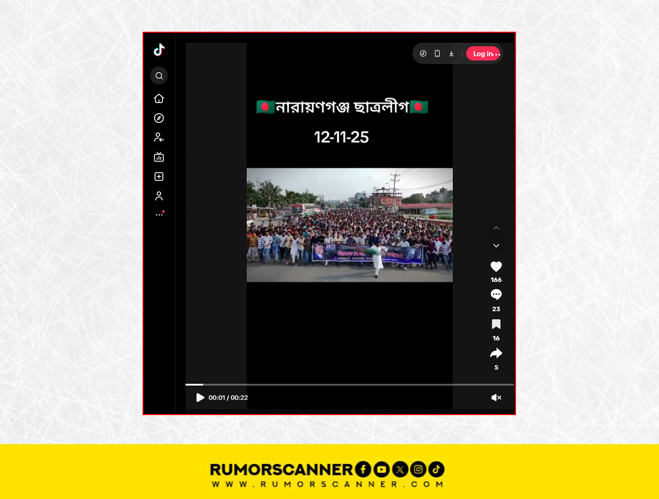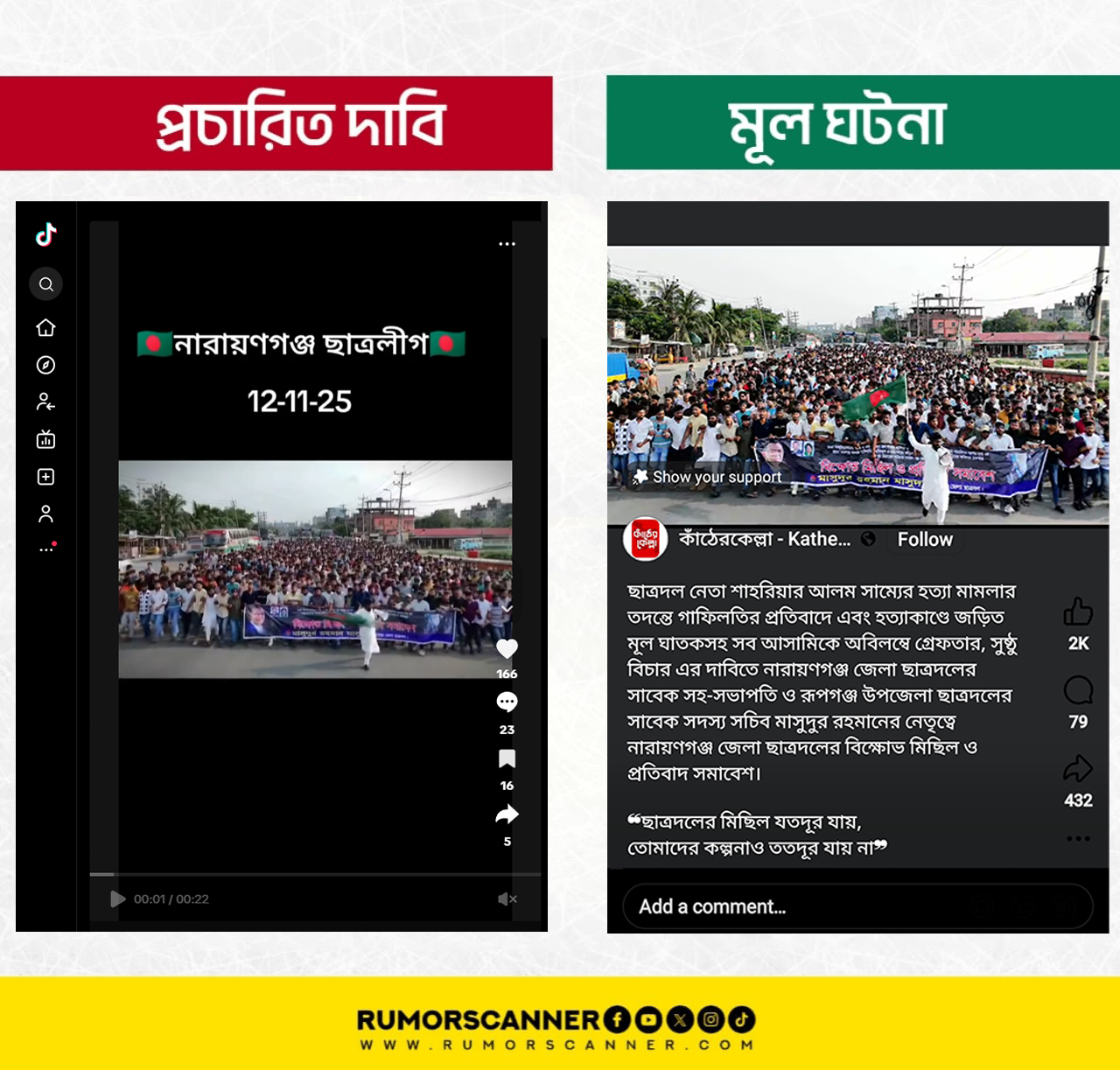 রিউমর স্ক্যানার টিমের অনুসন্ধানে জানা যায়, এটি নারায়নগঞ্জে ছাত্রলীগের কোনো মিছিলের দৃশ্য নয়। প্রকৃতপক্ষে, ১৮ মে ছাত্রদল নেতা শাহরিয়ার আলম সাম্যের হত্যা মামলার তদন্ত এবং সুষ্ঠ বিচারের দাবিতে ছাত্রদলের কর্মসূচির ভিডিওকে উক্ত দাবিতে প্রচার করা হয়েছে।
