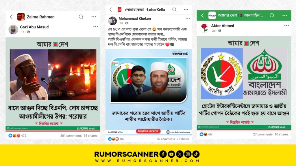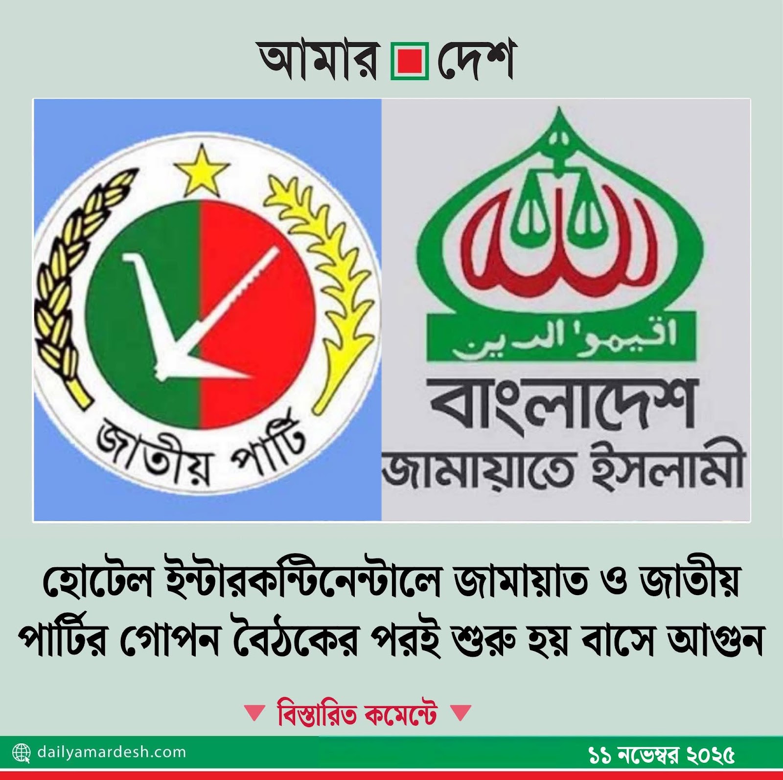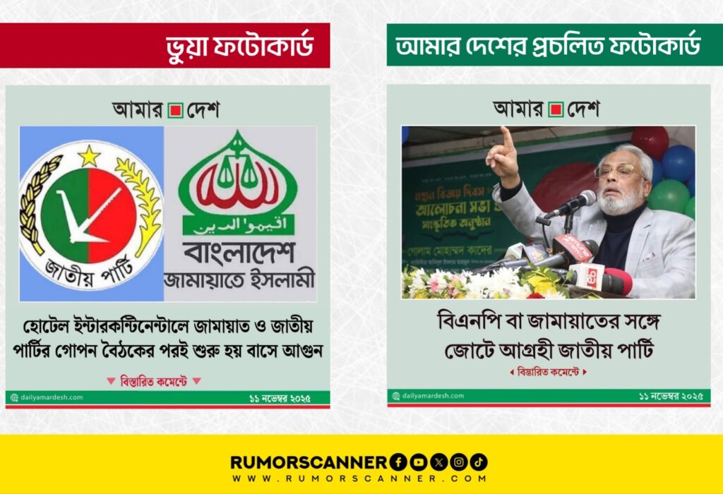 আমার দেশ এর ডিজাইন সংবলিত একটি ফটোকার্ডে দাবি করা হয়- ‘হোটেল ইন্টারকন্টিনেন্টালে জামায়াত ও জাতীয় পার্টির গোপন বৈঠকের পরই শুরু হয় বাসে আগুন’।