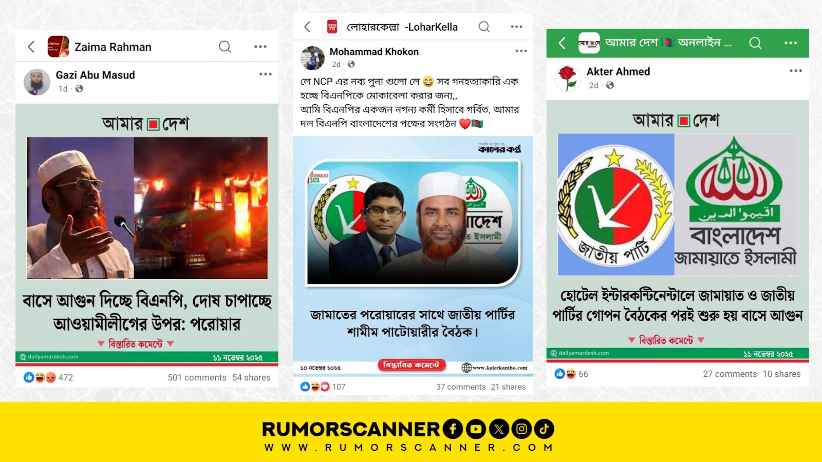 সম্প্রতি, বাংলাদেশ জামায়াতে ইসলামীর সেক্রেটারি জেনারেল অধ্যাপক মিয়া গোলাম পরওয়ার এবং জাতীয় পার্টির (জাপা) মহাসচিব শামীম হায়দার পাটোয়ারীর মধ্যে ঢাকার হোটেল ইন্টারকন্টিনেন্টালে একটি গোপন বৈঠক অনুষ্ঠিত হয়েছে দাবিতে ইন্টারনেটে একটি গুঞ্জন ছড়িয়েছে। তবে এই দাবিকে সম্পূর্ণ মিথ্যা ও ভিত্তিহীন উল্লেখ করে জামায়াতের পক্ষ থেকে নিন্দা ও প্রতিবাদ জানানো হয়েছে। এই ঘটনার প্রেক্ষিতে আওয়ামী লীগের লকডাউন কর্মসূচি ঘিরে বাসে আগুনের ঘটনাকে জড়িয়ে ইন্টারনেটে গণমাধ্যমের নামে একাধিক ফটোকার্ড প্রচার হতে দেখেছে রিউমর স্ক্যানার।