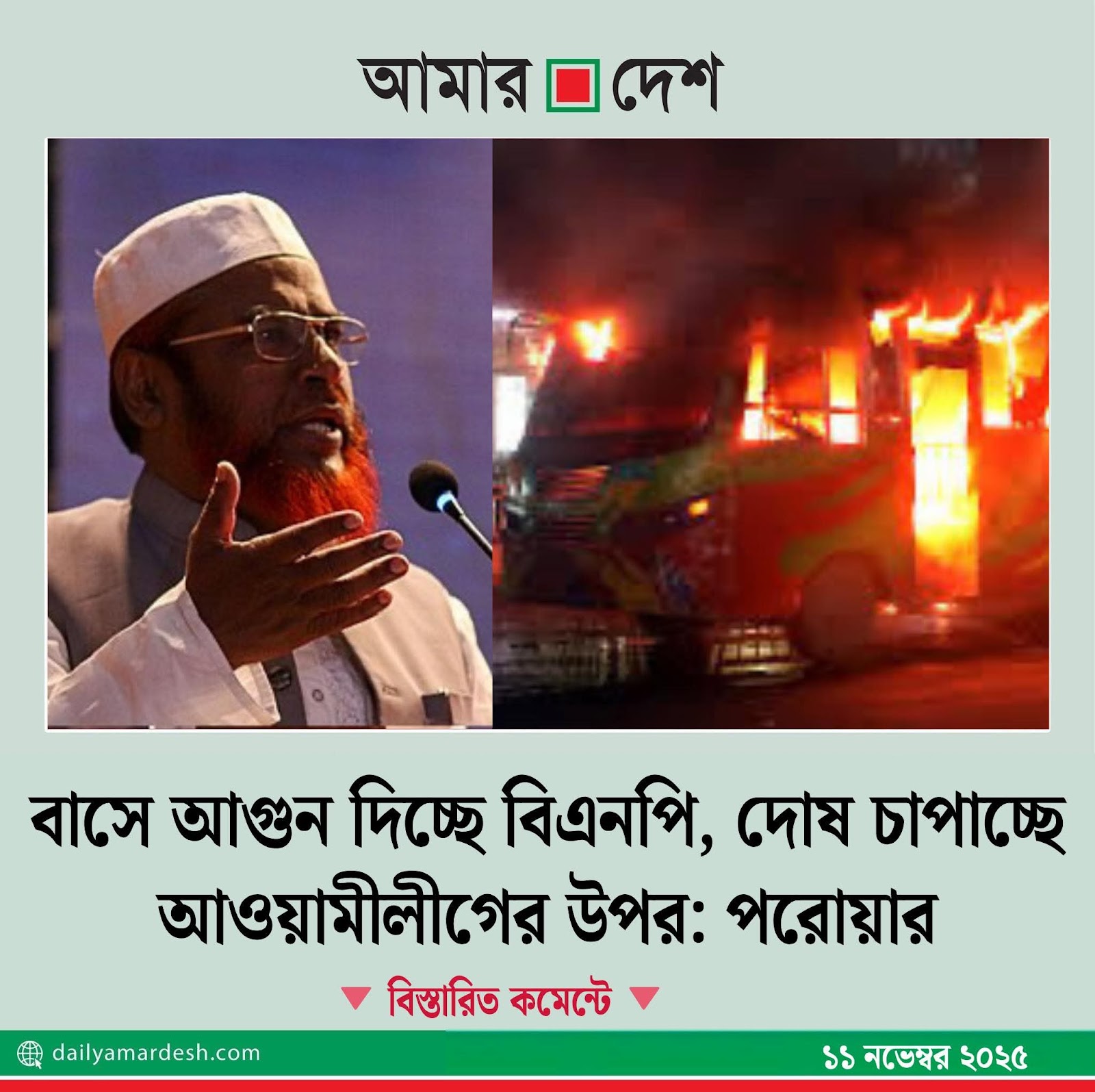 আমার দেশ এর ডিজাইন সংবলিত আরেকটি ফটোকার্ডে দাবি করা হয়- ‘বাসে আগুন দিচ্ছে বিএনপি, দোষ চাপাচ্ছে আওয়ামীলীগের উপর: পরোয়ার’।
