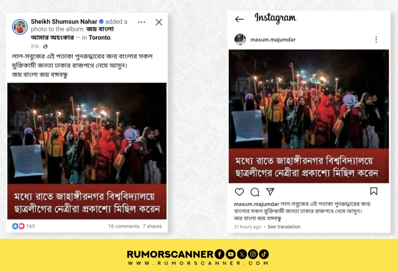 ১৩ নভেম্বর কার্যক্রম নিষিদ্ধ রাজনৈতিক দল বাংলাদেশ আওয়ামী লীগের ঘোষিত ঢাকা লকডাউন কর্মসূচিকে ঘিরে ‘মধ্যে রাতে জাহাঙ্গীরনগর বিশ্ববিদ্যালয়ে ছাত্রলীগের নেত্রীরা প্রকাশ্যে মিছিল করেন’ দাবিতে একটি ছবি ইন্টারনেটে ছড়িয়ে পড়েছে।