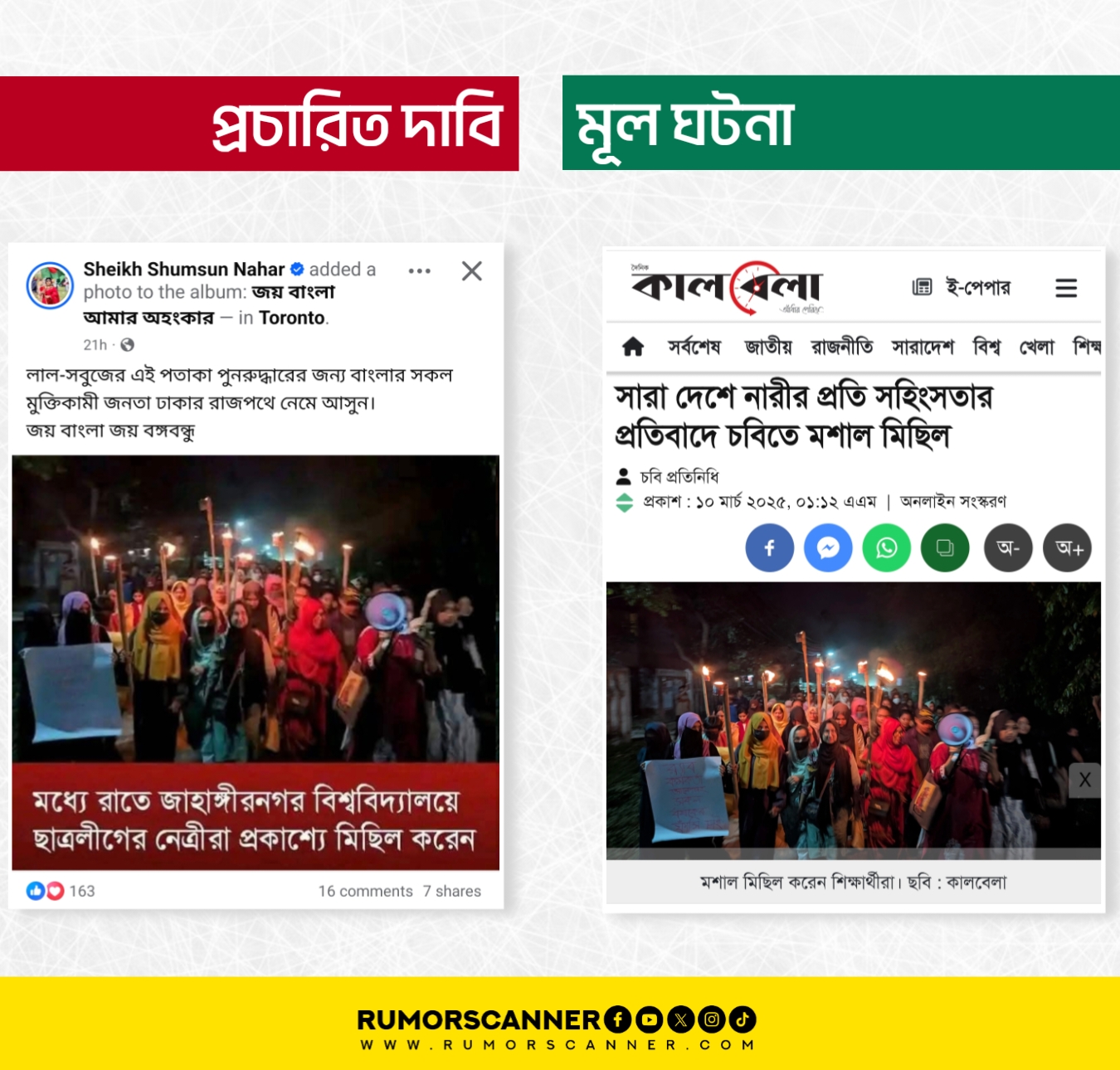 রিউমর স্ক্যানার টিমের অনুসন্ধানে জানা যায়, প্রচারিত ছবিটি জাহাঙ্গীরনগর বিশ্ববিদ্যালয়ে ছাত্রলীগের নেত্রীদের মিছিলের নয়, এমনকি ছবিটিও জাহাঙ্গীরনগর বিশ্ববিদ্যালয়েরও নয়। প্রকৃতপক্ষে, সারা দেশে নারীর প্রতি সহিংসতা ও ধর্ষণের বিরুদ্ধে প্রতিবাদ এবং দোষীদের বিচারের দাবিতে গত ০৯ মার্চ চট্টগ্রাম বিশ্ববিদ্যালয়ে মশাল মিছিল করেছিল শিক্ষার্থীরা। সেই মিছিলের ছবিকে আলোচিত দাবিতে প্রচার করা হচ্ছে।