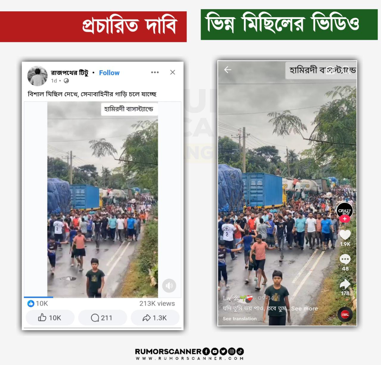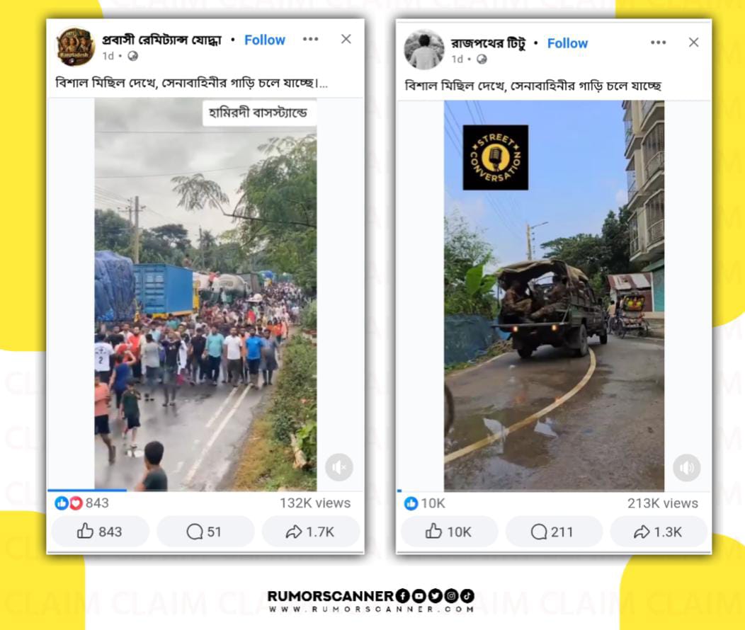 অর্থাৎ, সেনাবাহিনীর গাড়ি পেছানোর দৃশ্য ও হামিরদীর মিছিলের ভিডিও প্রকৃতপক্ষে দুই ভিন্ন ঘটনার পৃথক ভিডিও।