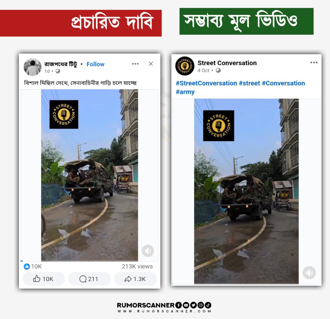 আলোচিত দাবিতে প্রচারিত ভিডিও পর্যবেক্ষণ করলে ভিডিওর শুরুতে সেনাবাহিনীর গাড়ি পেছানোর দৃশ্যে ‘STREET CONVERSATION’ নামের একটি লোগোর সংযুক্তি পাওয়া যায়। এরই সূত্র ধরে অনুসন্ধানে ‘Street Conversation’ নামের এক ফেসবুক পেজে গত ৪ অক্টোবরে প্রচারিত এক ভিডিও পোস্ট পাওয়া যায়। উক্ত ভিডিওর শুরুর দিকের অংশের সাথে আলোচিত দাবিতে প্রচারিত ভিডিওটিতে প্রদর্শিত সেনাবাহিনীর গাড়ি পেছানোর দৃশ্যের মিল পাওয়া যায়।